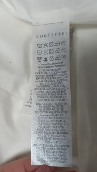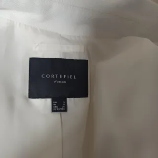 Americana de mujer en tallada de la marca CORTEFIEL en color blanco. Composición exterior: 52% poliéster, 48% viscosa. - Cuidado de la prenda: Lavar a máquina a 30°C, no usar lejía, planchar a temperatura media, limpieza en seco permitida, no usar secadora. Pocos usos ,en buenas condiciones. -Largo de manga 60cm, resto de medidas ver fotos. 1 abertura en espalda.