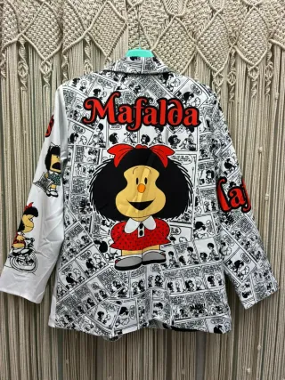 Americana con estampado de cómic de Mafalda. Diseño original y llamativo. - Estampado de viñetas de Mafalda en blanco y negro. - Detalle de personaje de Mafalda a color en la manga. - Cierre de botón. - Bolsillos frontales.