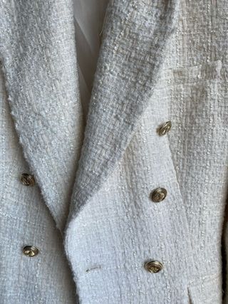 Elegante americana de Zara con un tejido texturizado en tonos blancos y beige. Un clásico renovado para cualquier ocasión. - Diseño de doble botonadura. - Botones dorados. - Bolsillos frontales.