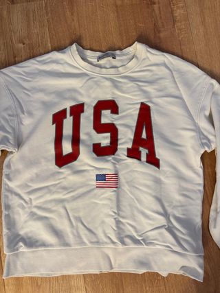 Sudadera blanca con diseño de USA y una pequeña bandera americana. - Estampado USA en letras rojas. - Bandera de Estados Unidos en la parte frontal.