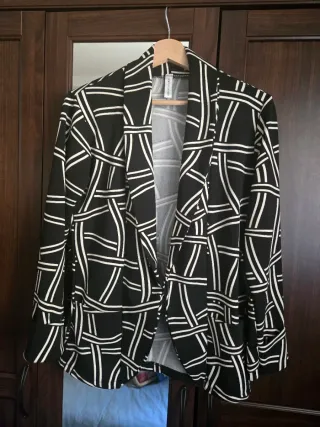 Americana con un llamativo estampado geométrico en blanco y negro. Presenta un diseño abierto y bolsillos. - Estampado geométrico. - Bolsillos frontales.