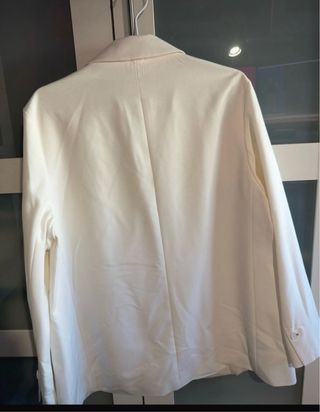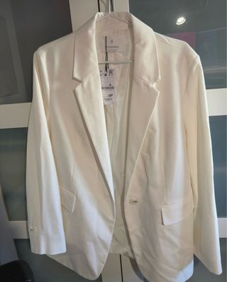 Americana de Stradivarius en color blanco, Talla L. Nueva sin estrenar, con etiquetas. - Diseño clásico y elegante. - Cierre de un botón. - Bolsillos frontales. - Puños con detalle de botones.