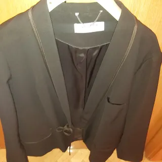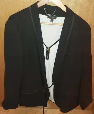 Conjunto de americana negra Mango talla XXL y blusa blanca de la marca October talla XL - Americana con solapas satinadas. - Blusa blanca sin mangas con detalle de cremallera dorada y ribete negro - Cierre de la americana con cordón Medidas americana: Sisa 63 cm Largo 73 cm Largo manga 58 cm Ancho manga 22 cm Medidas blusa: Sisa 60 cm Largo 68 cm