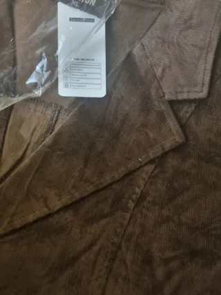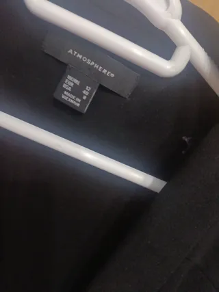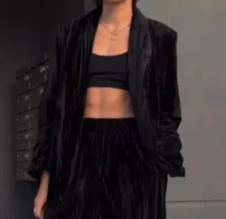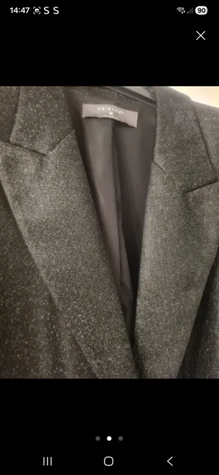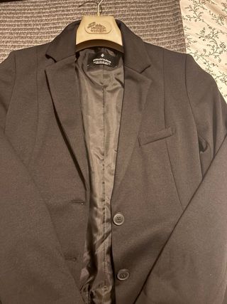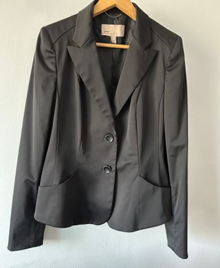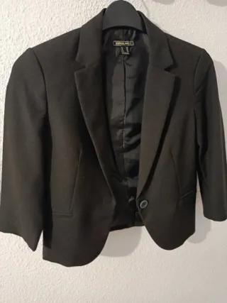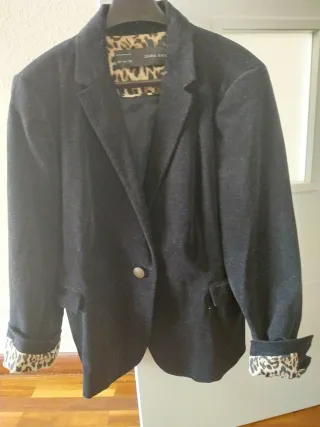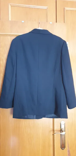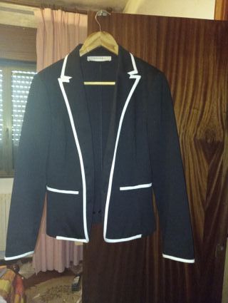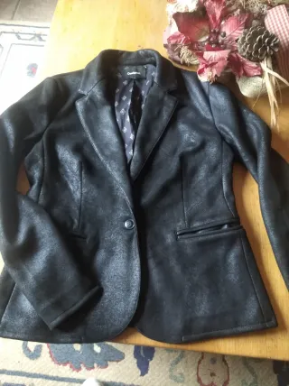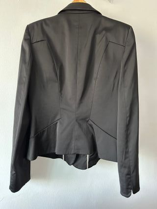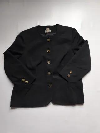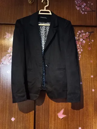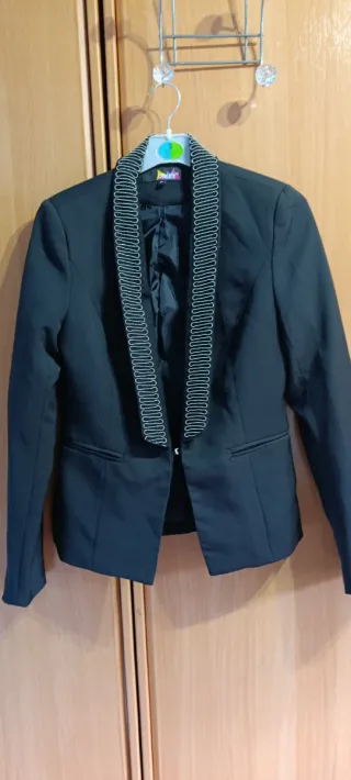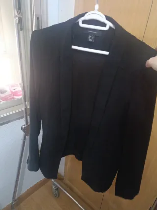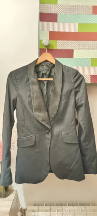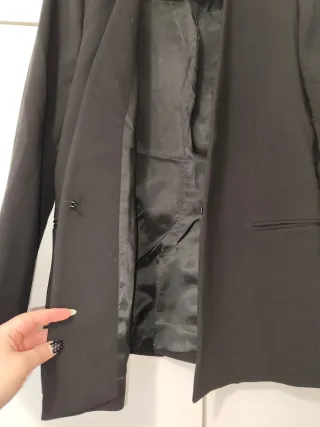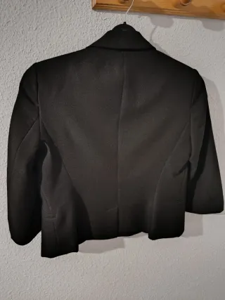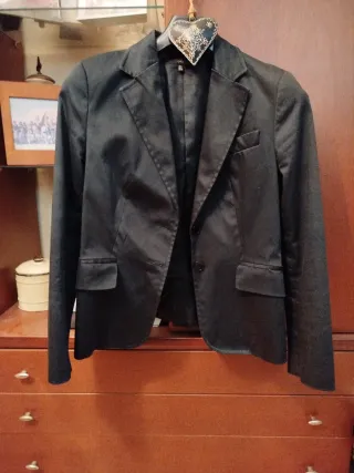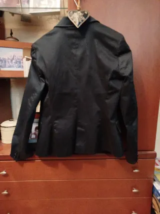 preciosa chaqueta americana negra muy entallada y buena tela de calidad con 2 bolsillos, esta impecable. un básico en el armario, combina con vestidos👗 faldas y pantalones 👖 me la he puesto en contadas ocasiones pero ahora no me vale por cambio de talla.