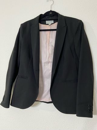 Americana o blazer de H&M en color negro. Un clásico versátil para cualquier ocasión. Talla S. Corta y entallada. En perfecto estado, puesta una vez. - Cierre de un botón. - Bolsillos frontales. - Puños con detalle de botón.