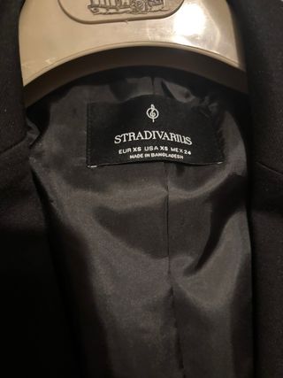 Americana negra de Stradivarius, ideal para un look elegante. • Largo: 60cm. • Largo manga: 52-61cm. - Cierre de un botón. - Bolsillos delanteros. - Puños con detalle de rayas.