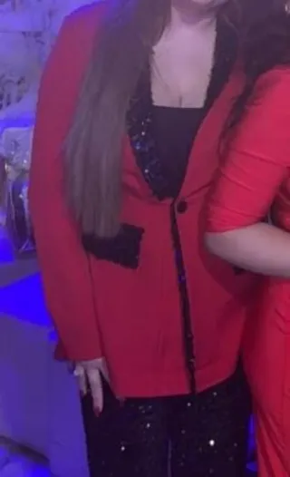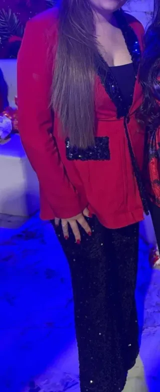 Americana elegante con detalles de lentejuelas. - Diseño llamativo en color rojo. - Adornos de lentejuelas negras. - Cierre de botón.