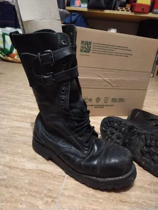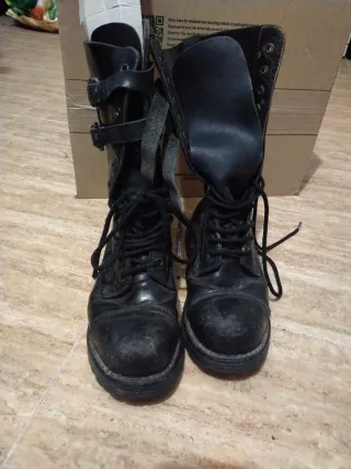 Botas de piel de caña alta con cierre de cordones y hebillas. Marca americana. Talla 39/40 - Material: Piel. - Color: Negro. - Diseño con doble hebilla. - Cierre de cordones.