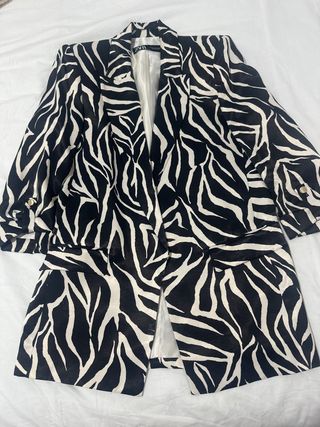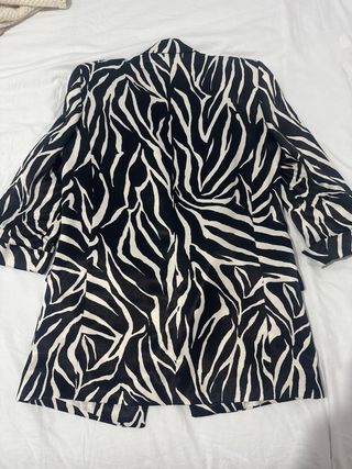 Americana larga con un llamativo estampado de cebra en blanco y negro. Es una prenda elegante y moderna. - Diseño de corte recto. - Solapas anchas. - Cierre frontal abierto. - Bolsillos de solapa en la parte delantera. - Puños con detalle de botón dorado.