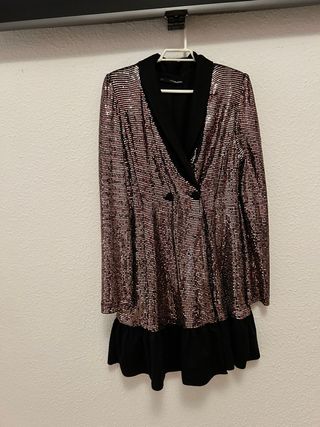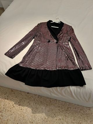 Vestido estilo americana con lentejuelas en rosa y negro. Presenta un diseño cruzado con botones y un volante en la parte inferior. Marca M pero también es L. - Mangas largas. - Cuello solapa negro. - Volante en el bajo.