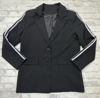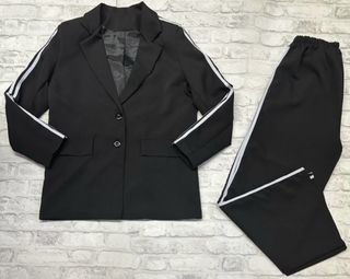 Conjunto de traje negro con rayas verticales laterales blancas en ambas piezas.La americana es fluida y oversize,tiene doble botonadura frontal y dos bolsillos falsos delanteros.El pantalón es de pata ancha y goma en la cintura para que sea súper cómodo y se ajuste a la perfección.El traje completo es talla única y serviría desde una talla 34 hasta una talla 42 ya que la blazer es oversize y con la goma que tiene el pantalón en la cintura se amolda perfectamente al cuerpo.Esta nuevo,usado solo una vez Medidas: Americana:Largo 73cm x Ancho de sisa a sisa 57,5cm Pantalón:Largo 104cm x Ancho de cintura 33cm x Ancho de cadera 50cm