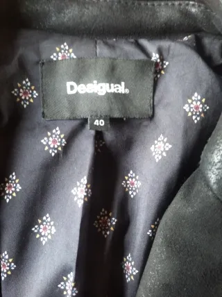 Americana elegante de la marca Desigual. - Diseño moderno y sofisticado. - Cierre de un botón. - Bolsillos frontales. - Forro interior estampado. Está usada pero bien conservada, la tela es de efecto desgastado