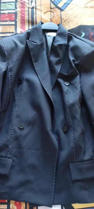 Elegante traje de pantalón para mujer, perfecto para ocasiones formales o de oficina. - Americana de diseño de solapa ancha, Mango. - Pantalon del Pull&Bear. - Cierre cruzado con botones. - Bolsillos frontales. En la manga derecha tiene un desperfecto porque tenía un bordado (se puede apreciar en la última foto). Tengo otros pantalones iguales, por si te interesa. Si tienes dudas de cualquier cosa del artículo, no dudes en preguntarme (medidas, más fotos,...). Puedes mirar mi perfil por si hay algo que te pueda interesar y así hacer un lote con descuento y te ahorras el envío. Precio negociable