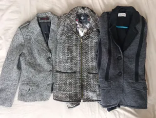 Lote de 3 americanas en talla 40, perfectas para oficina, eventos o looks arreglados. Todas con bolsillos delanteros útiles y en muy buen estado. 1️⃣ Americana gris con tiras negras – Clément Design (talla 40) – Tejido cálido, suave y cómodo – Corte clásico con detalles en negro – Ideal para vestir o para trabajar 2️⃣ Americana tweed en tonos gris/negro – Poqué (talla 40) – Efecto tweed, muy elegante – Cierre con cremallera – Combina con jeans o con looks más formales 3️⃣ Americana gris claro – Enrique Vals (talla 40) – Corte recto y botones delanteros – Tejido con textura tipo mezcla – Muy versátil y favorecedora 📌 Estado: Muy bue