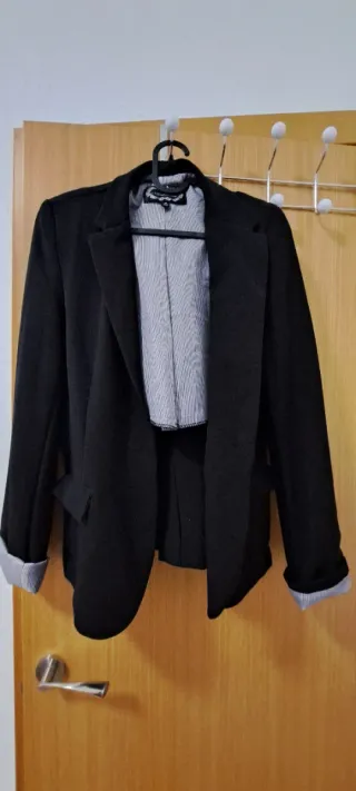 Americana de vestir en color negro. Un clásico que no puede faltar en tu armario. - Diseño de solapa ancha. - Cierre cruzado con botones. - Bolsillos frontales. En la manga derecha tiene un desperfecto porque tenía un bordado (se puede apreciar en la última foto). Tengo unos pantalones que pueden ir a juego en mi perfil. Si tienes dudas de cualquier cosa del artículo, no dudes en preguntarme (medidas, más fotos,...). Puedes mirar mi perfil por si hay algo que te pueda interesar y así hacer un lote y pagas un envío. Precio negociable