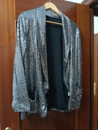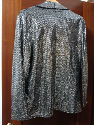 Americana de mujer con un diseño llamativo y elegante. - Acabado con lentejuelas plateadas. - Forro interior negro. Conjunto americana y pantalón