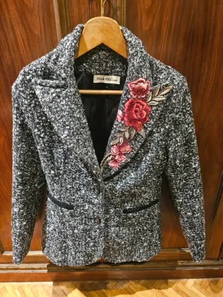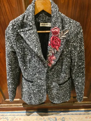 Americana de la marca YOU&YOU con un diseño moderno y elegante. Perfecta para añadir un toque especial a tu look. - Tejido texturizado en gris y blanco. - Detalle de bordado floral en tonos rojos y rosas en la solapa. - Bolsillos frontales con ribete negro.