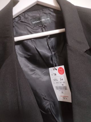 Chaqueta tipo levita larga de color negro. Es una prenda elegante y versátil. Es un clásico de estas ahora no hay tiene una pequeña mancha como se aprecian la foto en uno de los bolsillos no sé cómo se ha hecho está sin estrenar no se ha puesto nunca supongo que al lavarla se irá es monísima y súper elegante y moderna - Cierre cruzado con botones. - Dos bolsillos frontales con solapa. - Botones decorativos en puños.