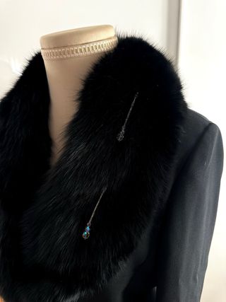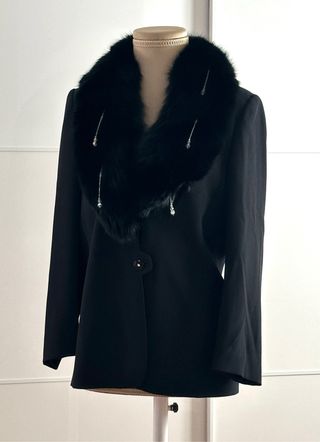 Elegante americana vintage en color negro con cuello de pelo suave extraible. El pelo está decorado con algunas tiras de cristal facetado. Cierre con dos botones con pequeño cristal diamante en el centro Un clásico que nunca pasa de moda. - Cuello de pelo sintético - Cierre de botón - De poliéster