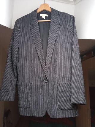 Americana de mujer de estilo clásico con un toque moderno. Color negro con finas rayas blancas que le dan un acabado brillante y sofisticado. Corte recto, con solapas anchas y cierre frontal de un solo botón. Lleva dos bolsillos delanteros y forro interior. Perfecta para eventos, trabajo o para combinar con unos vaqueros y crear un look más casual-chic. Tejido ligero y cómodo, ideal para entretiempo. 🧶 Material: 50% algodón, 50% viscosa 📏 Talla: 40 📏 Medida hombros: 42cm 🎨 Color: negro con rayas blancas ✅ Estado: muy bueno, apenas usada Ideal para quien busca una prenda elegante y versátil que nunca pasa de moda.