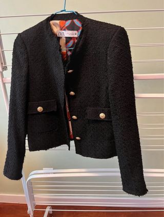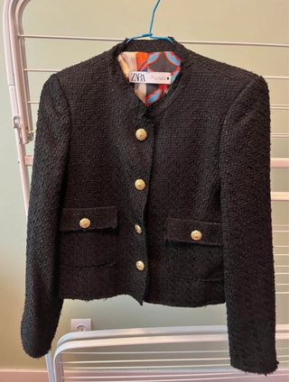 Elegante americana de Zara con un diseño clásico y sofisticado. - Tejido tweed texturizado. - Cierre con botones dorados. - Bolsillos frontales con solapa. - Forro interior estampado.