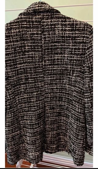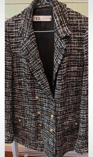 Elegante americana de Zara con un diseño tweed en blanco y negro. Un clásico que aporta estilo a cualquier look. - Cierre de doble botonadura con botones dorados. - Bolsillos frontales con solapa. - Acabado deshilachado en cuello y puños.