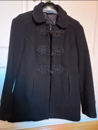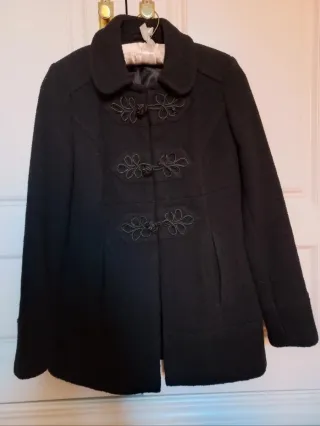Elegante abrigo de la marca Zara en color negro. Presenta un diseño clásico con detalles decorativos. - Cierre frontal con botones. - Cuello redondo. - Bolsillos laterales. Regalo americana de H&M