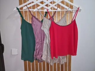 Lote de ropa de mujer de diferentes marcas. Incluye blusas y camisas con distintos estampados y detalles. - 4 blusas blancas entre ellas 2 estampadas - 4 blusas de tirantes - 3 blusas color entre ellas una con la etiqueta - 1 parka negra - 1 americana corta verde - 2 blusas sin mangas