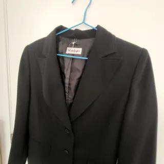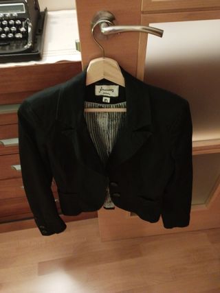 Chaqueta clásica de color negro, talla M. Es muy elegante y bastante básica. Perfecta para los eventos con protocolo (ferias, congresos, para trabajar de azafata de eventos, etc.). Tiene dos bolsillos no muy profundos y un botón. Asimismo, tres botones en cada manga. Es muy cómoda y abriga bien ya que tiene otra capa interior. En perfecto estado, puesta solo en una ocasión. Sin manchas, agujeros y otras imperfecciones.