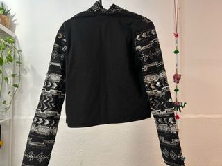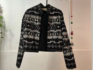 Americana de estilo étnico, tejida a mano con un diseño geométrico y tribal - Adornada con lentejuelas plateadas. - Corte cropped.
