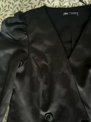 Americana elegante de Zara en color negro. Un básico versátil para cualquier ocasión. - Corte entallado. - Cierre de un botón. - Bolsillos frontales. - Forro interior con estampado.