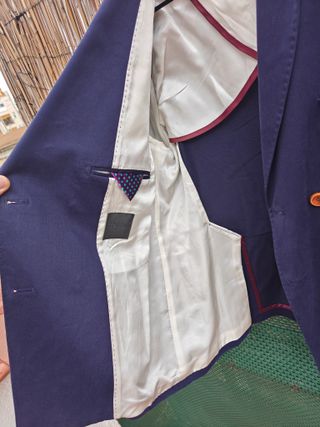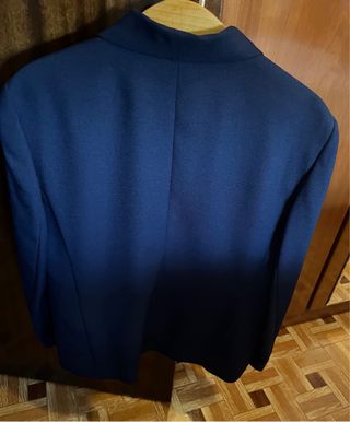 El color es azul oscuro. Es la talla 40 de Benetton. Tiene botones por atrás en las mangas y dos bolsillos en los lados. La tela no es lisa de traje.