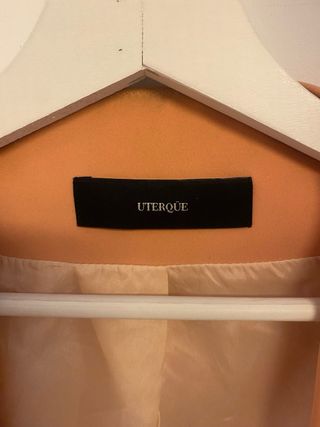 Elegante americana de Uterque en un llamativo color naranja. Presenta un diseño moderno con detalles de pliegues. - Corte entallado. - Solapas pronunciadas. - Forro interior de satén. - Tiene una pequeña mancha de tinta