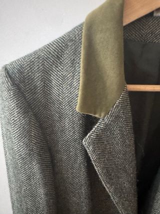 Americana con un diseño clásico de espiga. El cuello es de un suave tejido en contraste. Estampado tipo espiga de color verde.