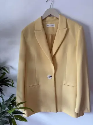 Blazer talla 44 de color amarillo pastel muy favorecedor. Destaca por su botón central con relieve dorado que le da un aire vintage y sofisticado. Forro interior a juego. - Color: Amarillo vainilla / pastel. - Detalles: Botón dorado decorativo.