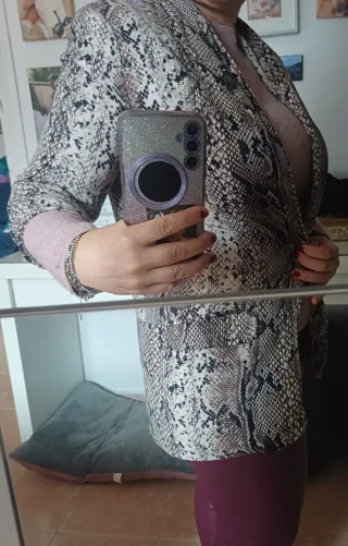 Americana de mujer con un llamativo estampado de serpiente. - Diseño abierto sin botones - Manga 3/4 - Cuello solapa.