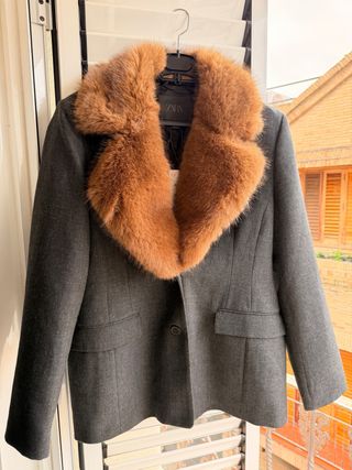 Americana de la marca Zara con un elegante cuello de pelo. - Color gris marengo. - Detalle de cuello de pelo en tono marrón.
