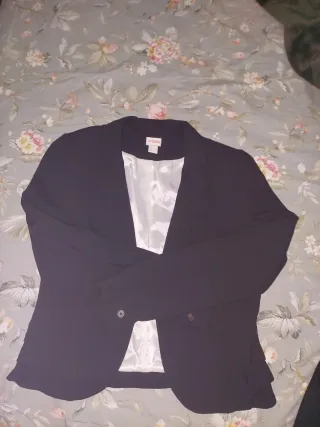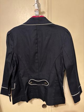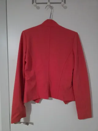 Es una americana ligera de punto muy suave y agradable de tacto, buena caida, tiene bolsillos reales. Lleva forro completo rojo con pequeños topitos blancos. La llevé para una comunión, está totalmente nueva, sienta muy bien. Es ideal tanto para eventos como para el diaya dia. Muy cómoda de llevar. Regalo la blusa que es de algodón muy fino, tipo batista con chorreras, es preciosa, es un poco más ancha qué la chaqueta, clarea algo tal como se ve en las fotos . La he usado bastante pero aún está en buen estado, sólo le falta algún botón