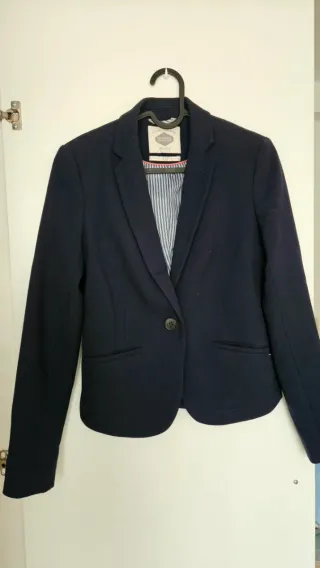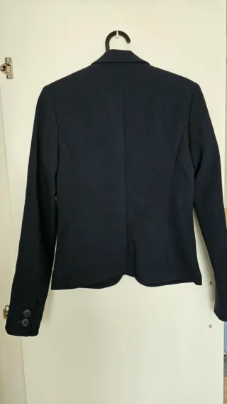 Chaqueta blazer americana azul de Zara talla 38 M de mujer, poco uso. Tiene un enganchoncico pequeño en la manga izda pero apenas se nota, adjunto foto. Y un roce en el botón de delante pero tampoco se nota mucho. Lleva hombreras y forro azul marino interior. Marca Zara Basic, en etiqueta pone talla L pero da como una talla 38 M. Medidas: 40 cm ancho hombros x 56 cm largo x 42 cm ancho cintura (84 cm contorno entero). Mangas miden 61 cm largo x 14 cm ancho (28 cm contorno). 95% viscosa 5% elastán. Si eres de Zaragoza se puede recoger en San José, Aragonia o Parque grande.