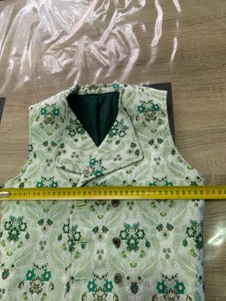 Chaleco para niño con un diseño tradicional fallero. Presenta un estampado floral y detalles en verde y blanco - Diseño con solapa. - Cierre de botones. - Tejido con textura.