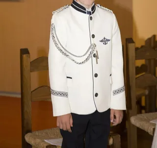 Elegante traje de comunión para niño, perfecto para un día especial. - Chaqueta blanca con detalles en negro. - Pantalón negro. - Adornos dorados y azules en la chaqueta. - Escudo bordado en la solapa.