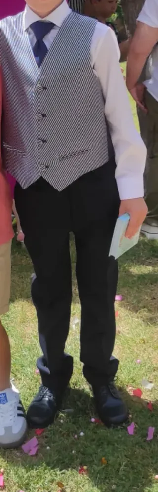 Traje de niño de la marca Coconut, ideal para ocasiones especiales. Talla 9 - 10 años, además ofreco otro pantalón del mismo modelo de la talla 11-12 años - Chaqueta de color azul con forro a rayas. - Cierre de un botón. - Dos bolsillos delanteros. - Detalle de botones en los puños. -Dos pantalones cortos tallas 9-10 y 11-12 años - Chaleco a juego.