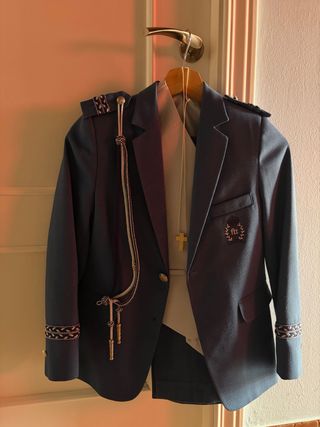 Traje de chaqueta para niño, ideal para celebraciones especiales. - Chaqueta azul con detalles dorados. - Incluye cordón decorativo. - Escudo bordado en la solapa.