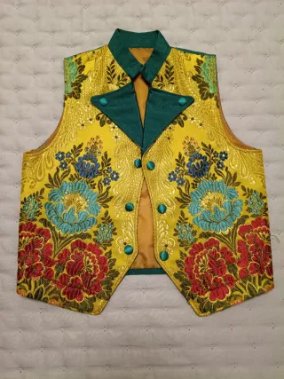 Chaleco tradicional para niño, ideal para fiestas falleras. - Diseño con bordados florales en amarillo y verde. - Cierre de botones. - Cuello y solapas decoradas.