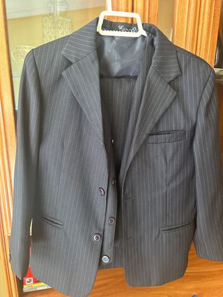 Traje niño completo. Talla 12 años, chaqueta y pantalon el mio lo llevo para la comunión, solo un uso. Esta como nuevo. Viene con la corbata. El pantalón tiene margen para sacar si fuera otra altura pero el mio era más bien alto.