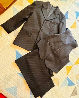 Conjunto traje formal para niño (americana, chaleco y pantalon) talla 10, en buen estado; color negro con rayas. Poco uso.