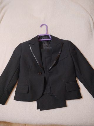 Traje de niño 6 años, hecho a medida en sastrería. Se ha puesto una única vez. Medidas en las fotos. Traje americana y pantalón negro con detalle en el borde de la solapa de la americana en negro brillo.