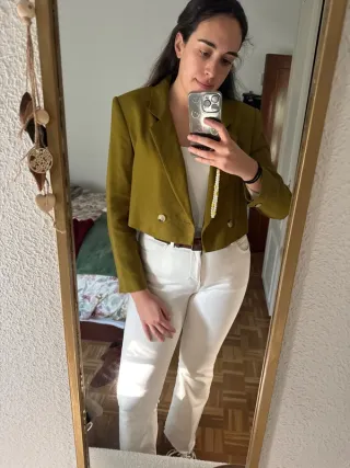Americana corta de Zara en color verde oliva. Un diseño moderno y elegante. - Corte cropped. - Doble botonadura dorada. - Cuello solapa.