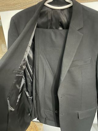 Traje formal de dos piezas. - Chaqueta con solapa de muesca. - Cierre de dos botones. - Dos bolsillos de solapa en la parte delantera. Utilizado solo una vez