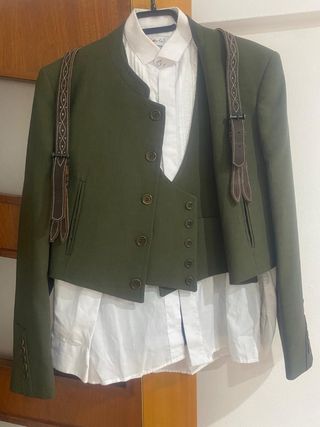 Conjunto de traje tradicional con chaqueta y chaleco. - Chaqueta de color verde con cuello mao. - Chaleco a juego. - Camisa blanca con detalles. - Tirantes decorativos.